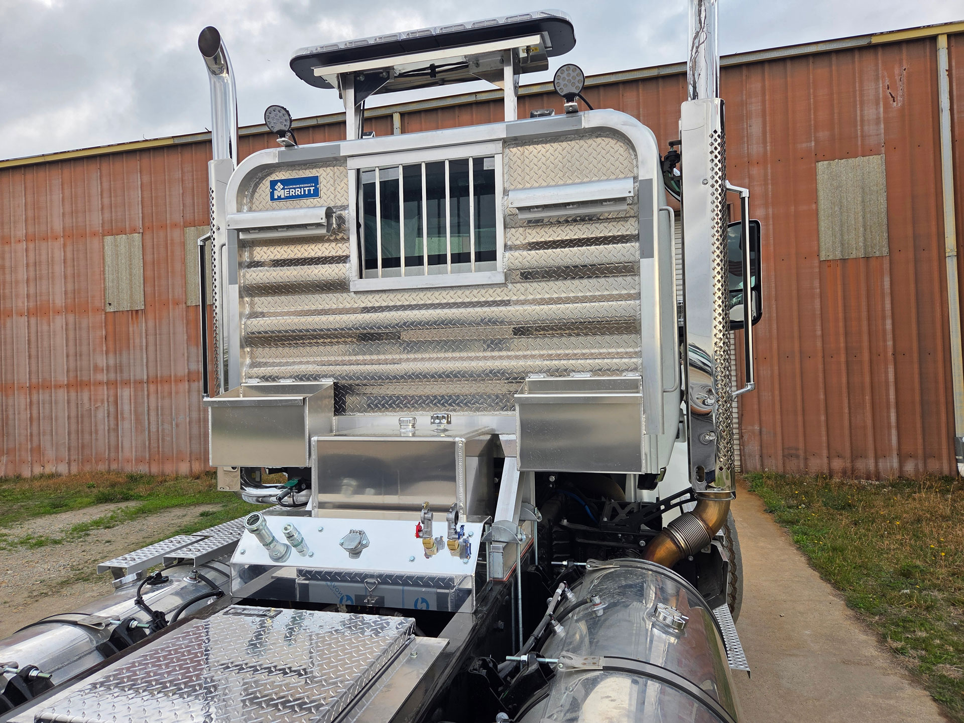 Because heavy haul operations require reliability, every component of this truck setup serves a specific purpose. From the aluminum cab rack to the integrated Merritt connection box, the design focuses on functionality and long-term performance. As a result, operators benefit from improved jobsite efficiency and better equipment protection.